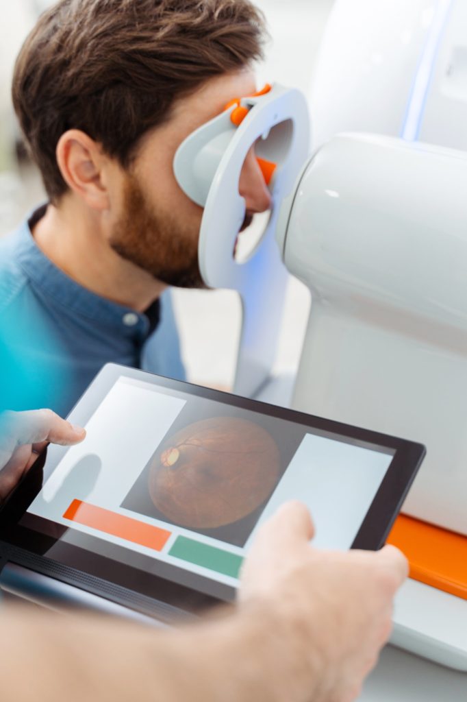 Mesure de l’acuité visuelle, examen du fond d’œil, tonométrie, tests de Tomographie en Cohérence Optique (OCT), champ visuel, etc